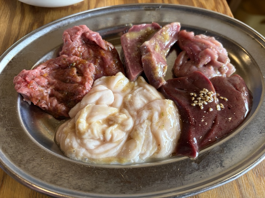 The assorted horumon platter included white horumon (fatty intestines), premium red horumon, heart, liver, and gatsu. Even before grilling, the differences in texture and appearance were obvious, encouraging a more deliberate approach to each cut.