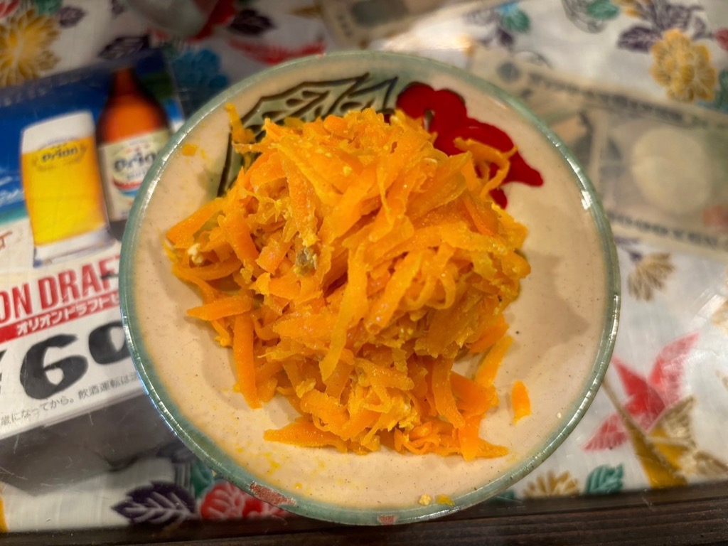 Ninjin shirishiri combined the natural sweetness of carrots with the softness of eggs, resulting in a gentle, comforting flavor. The carrots retain enough texture to release their sweetness with every bite, making it easy to understand why this dish is a long-standing Okinawan staple. It pairs equally well with alcohol or rice.