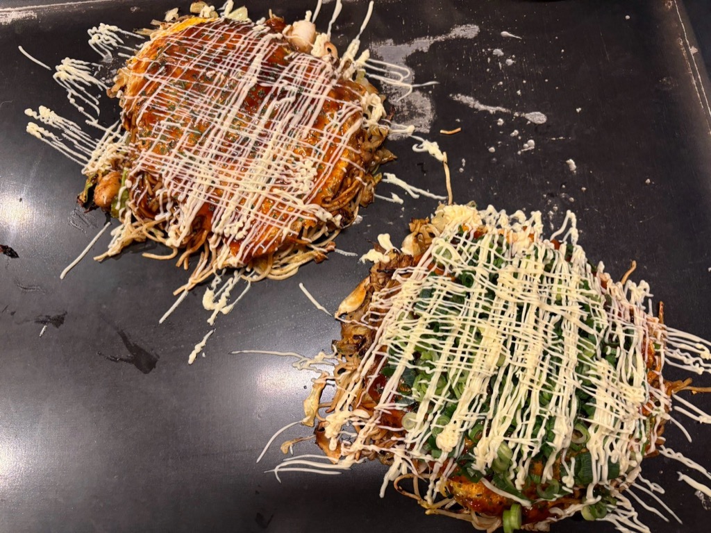私は2種類のお好み焼きを頼んで、ひとつはベーシックな味のもの、もうひとつは少し変化をつけたトッピング付きのものを食べ比べました。ベーシックな方はソースと麺、キャベツの一体感が素直に楽しめ、トッピングの方はアクセントが加わることで飽きずに食べ進められました。