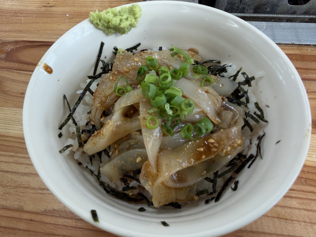 焼き物をある程度食べたところで、丼ものに移りました。イカ丼は一杯 550円前後で、私は「焼き続けていると口が濃くなる」タイミングで頼んだのですが、これがかなりちょうどよかったです。イカは噛み切りやすくて、甘みが出るまでの距離が短い感じでした。貝の余韻を一回リセットしながら食べ直せるので、後半の立て直し役として強かったです。